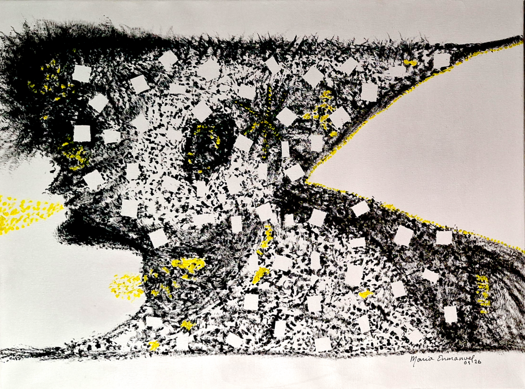 I was going through a tormented moment with my psychology class. But at the same time, my partner was supportive and very proud of me. I took my acrylic marker and broke the canvas with black dots to reduce my stress. I drew river lines to express to myself that it’s just a semester and will finish, and after that, I knew I would be more open and navigate as a snake in the river and connected with the community as a radio antenna.